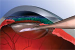 In phacoemulsification, an ultrasonic oscillating probe is inserted into the eye. The probe breaks up the center of the lens. The fragments are suctioned from the eye at the same time. A small incision that often does not require sutures to close can be used, since the cataract is removed in tiny pieces. Most of the lens capsule is left behind and a foldable intraocular lens (IOL) is implanted permanently inside to help focus light onto the retina. Vision returns quickly and one can resume normal activities within a short period of time.